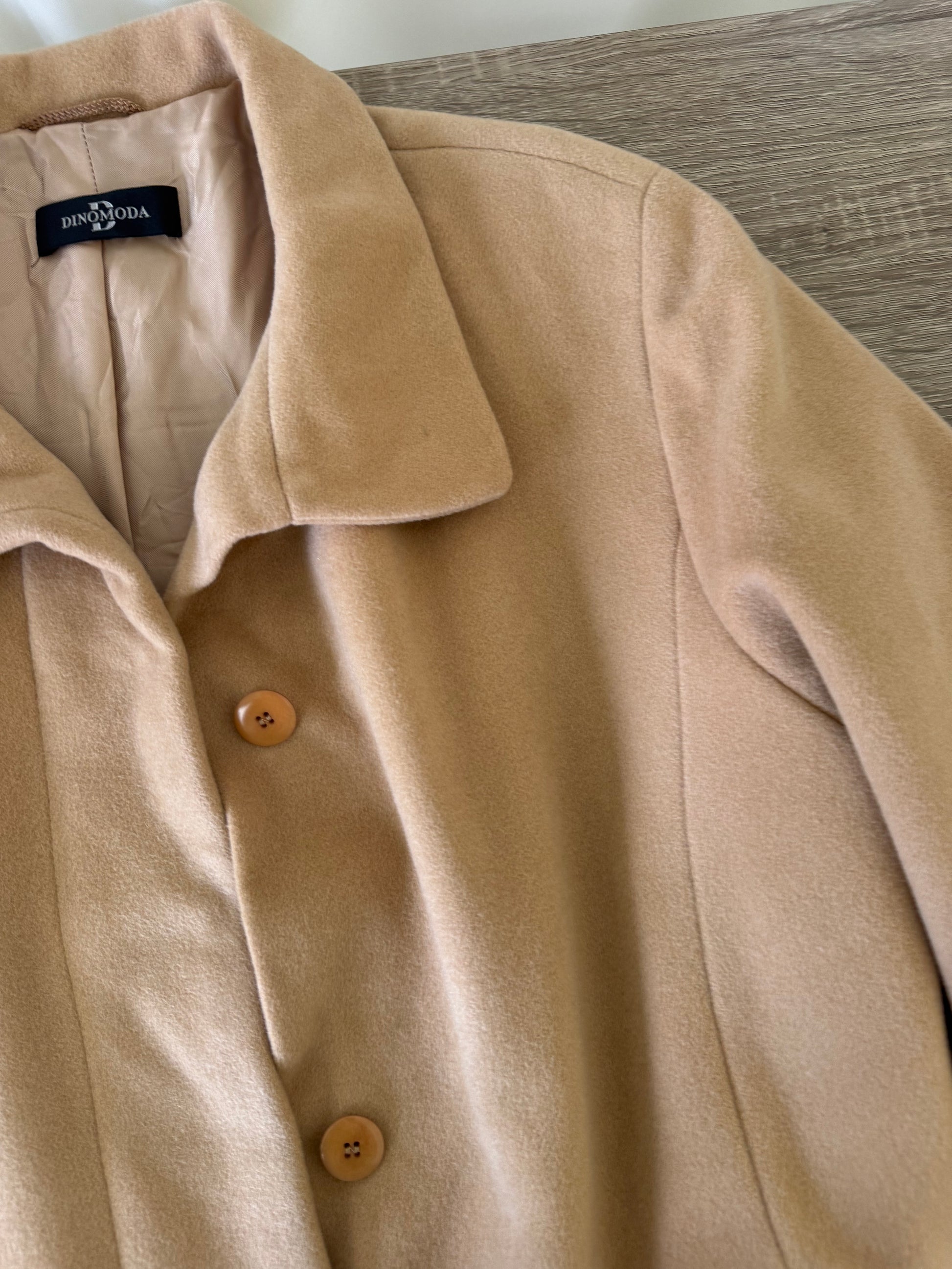 Palton vintage superb într-o nuanță frumoasă de nude/ camel, 75% lână și angora, detaliu la spate și slituri laterale.