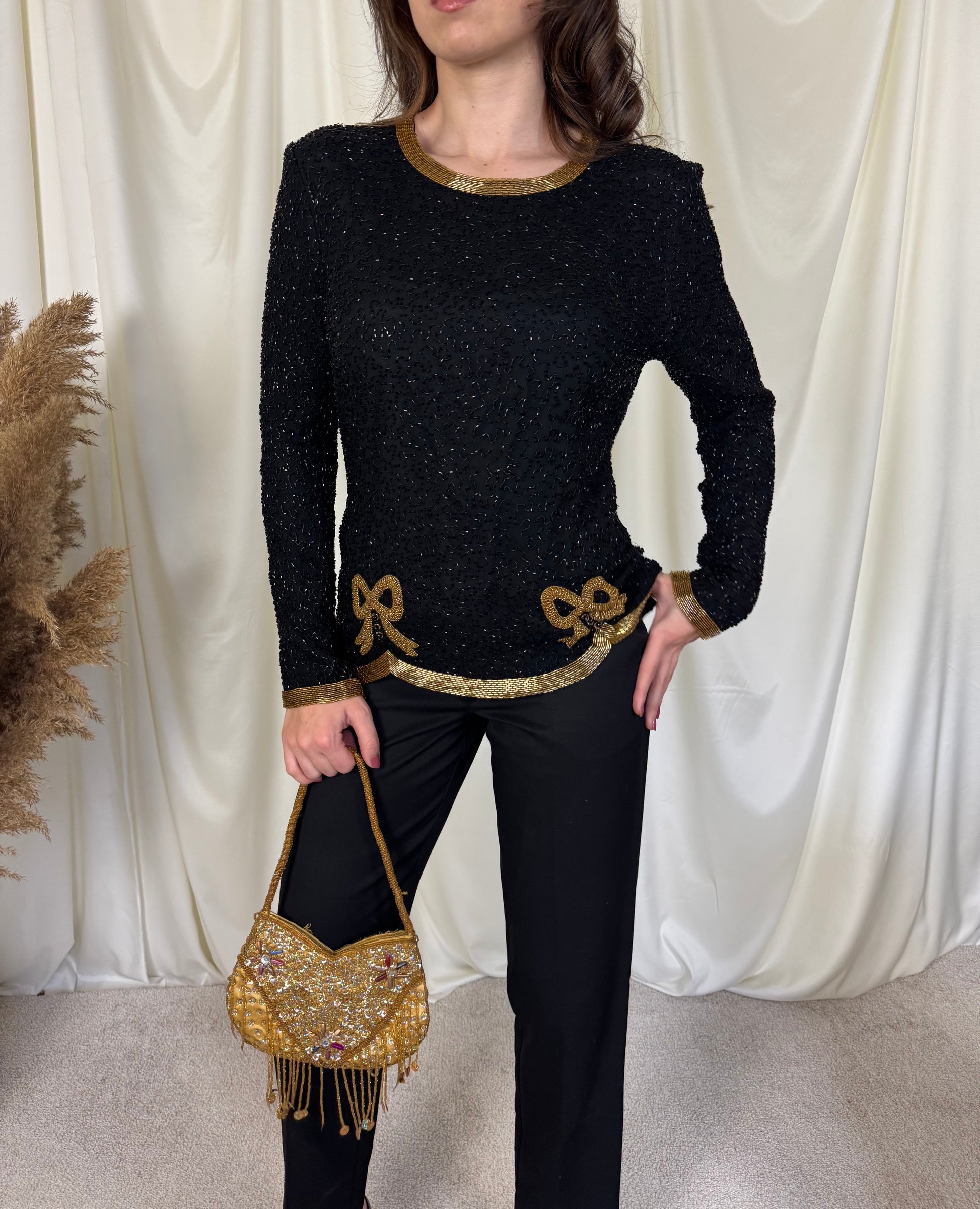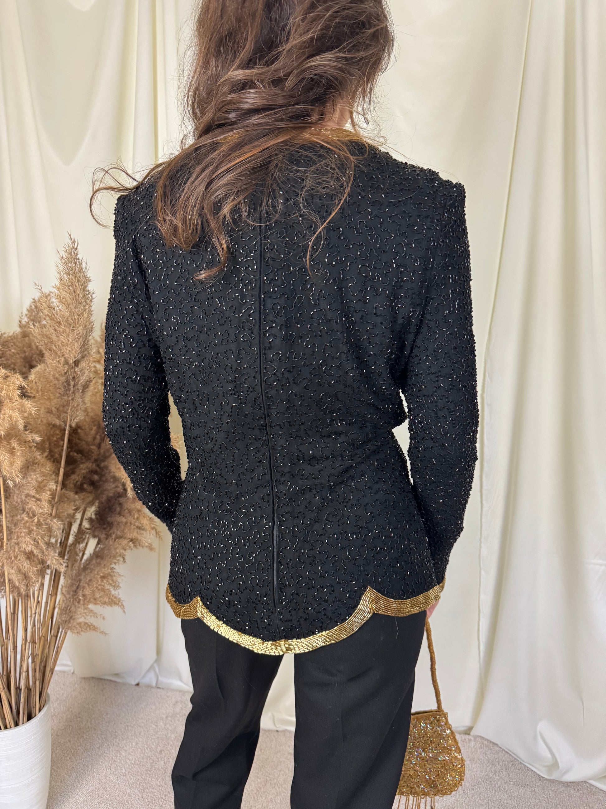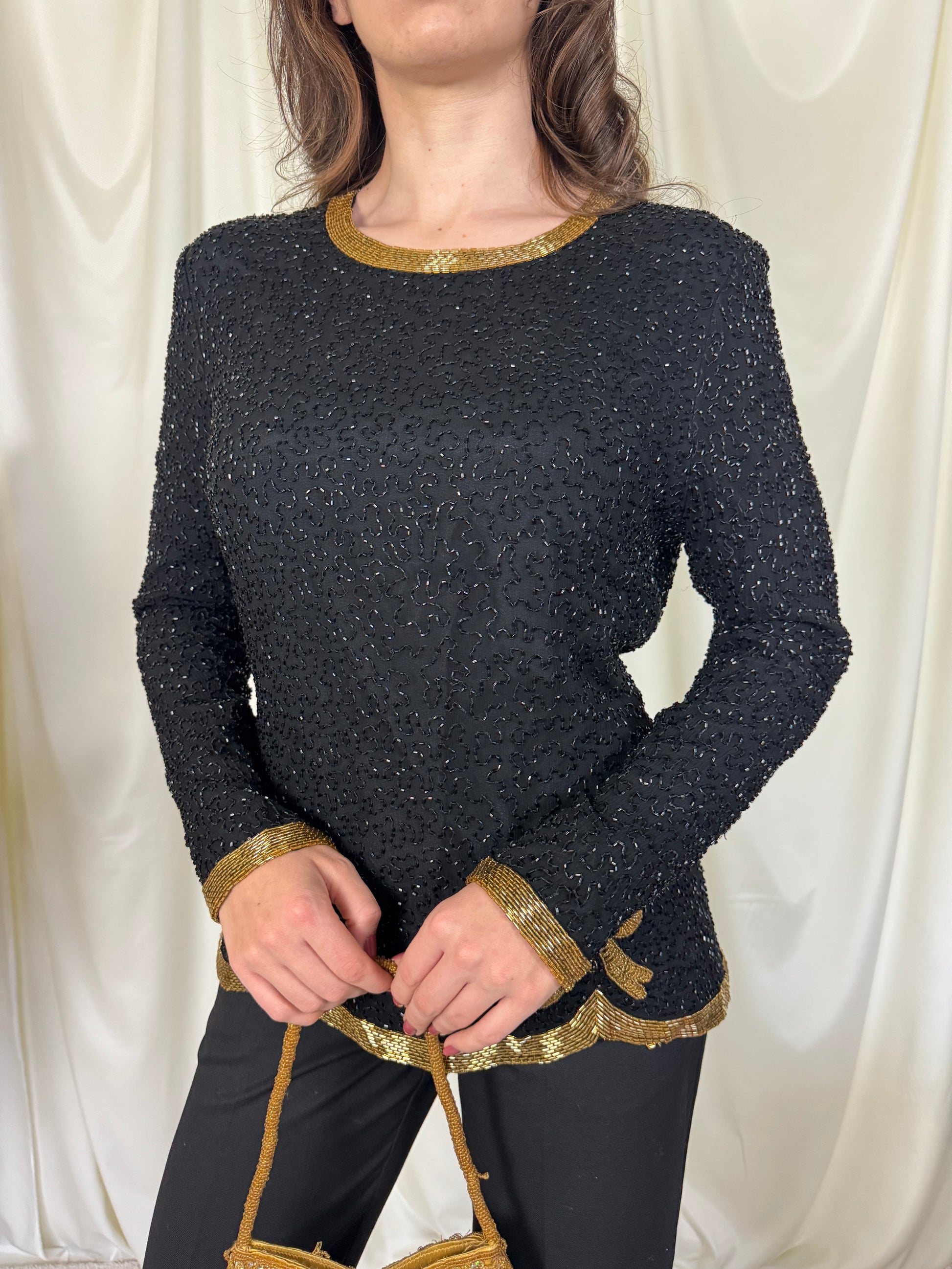 Piesa vintage rară, tip bijuterie, mărimea S. 100% mătase naturala, mii de mărgele aplicate , închidere la spate cu fermoar.