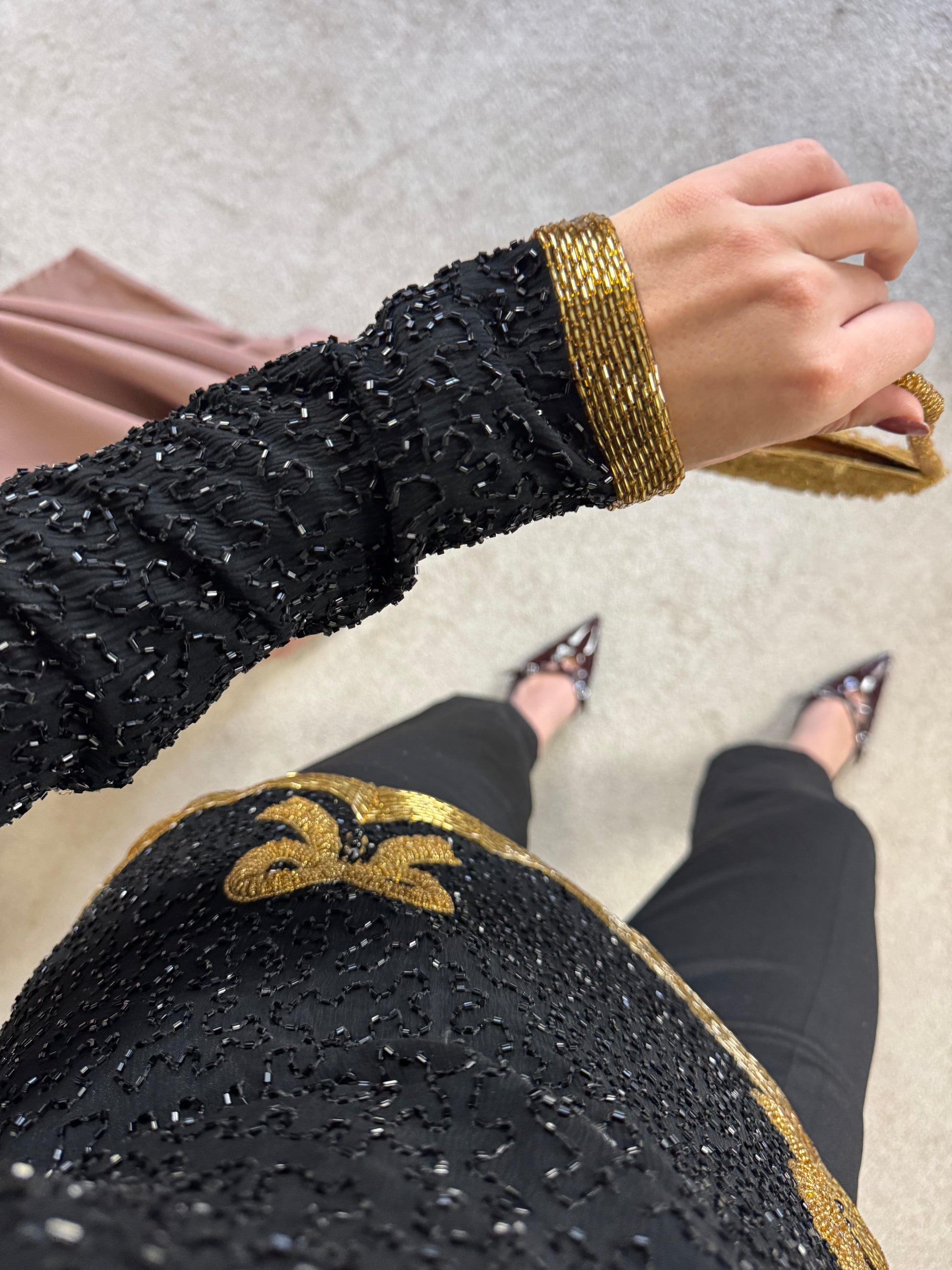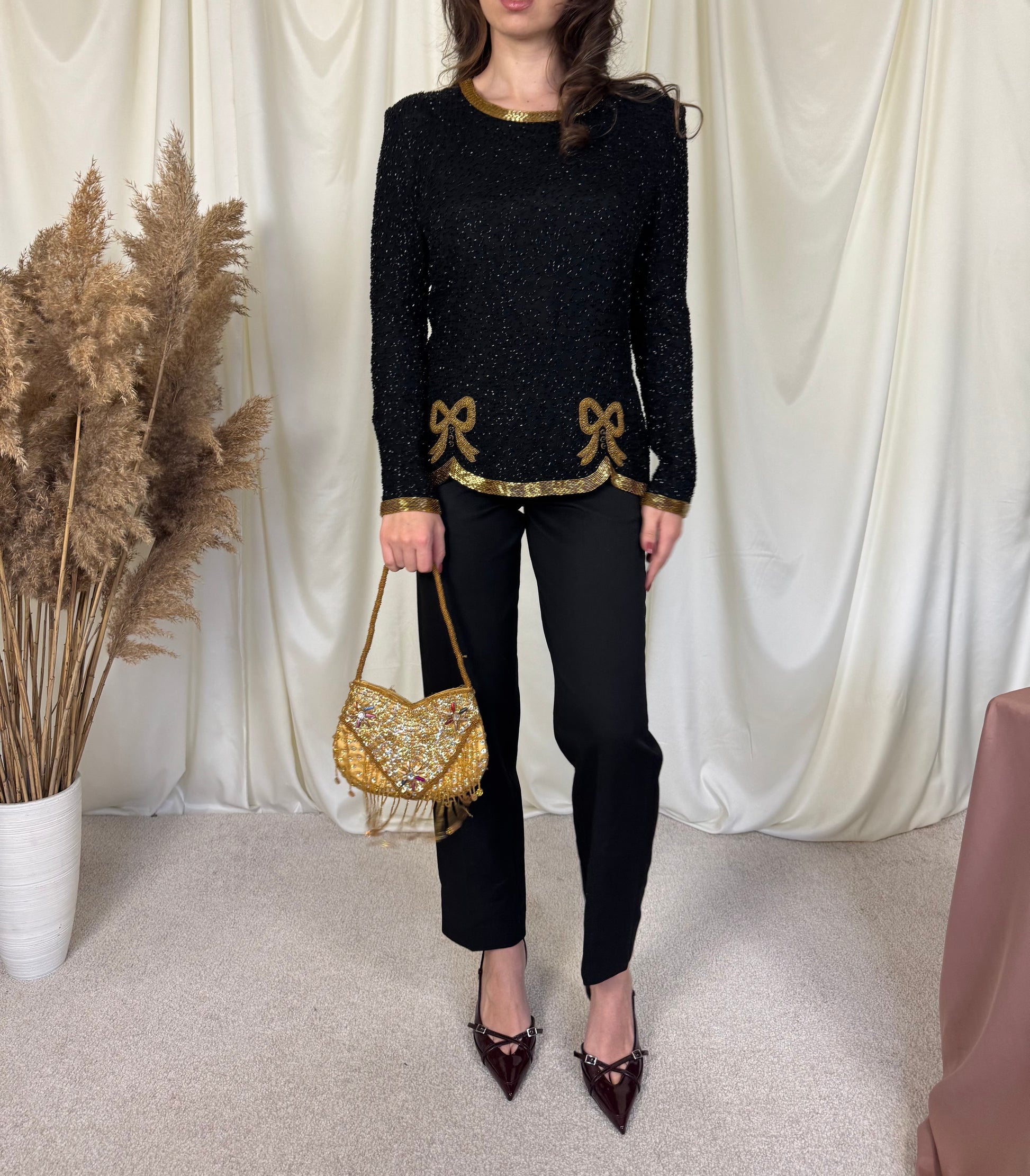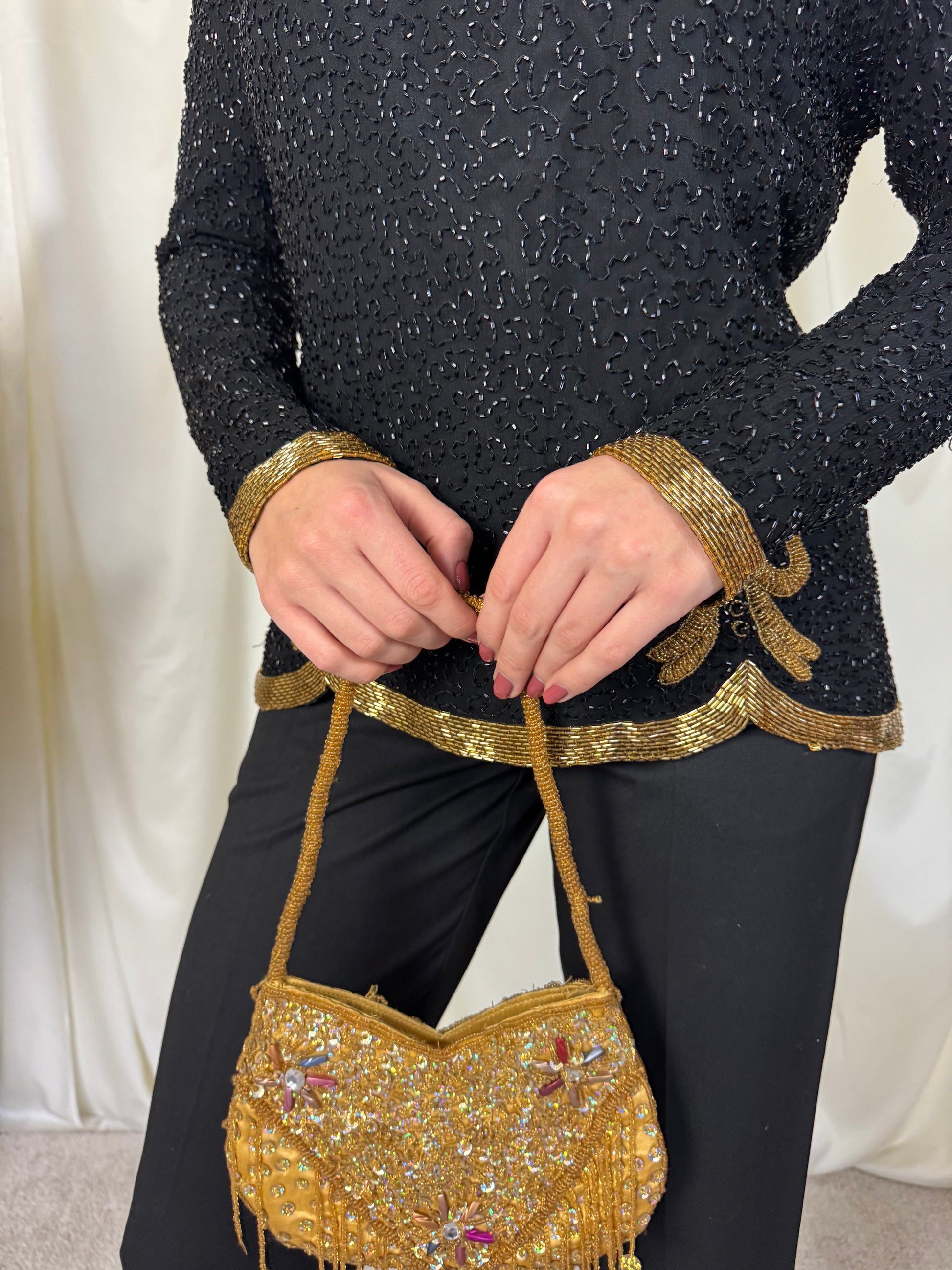 Piesa vintage rară, tip bijuterie, mărimea S. 100% mătase naturala, mii de mărgele aplicate , închidere la spate cu fermoar.