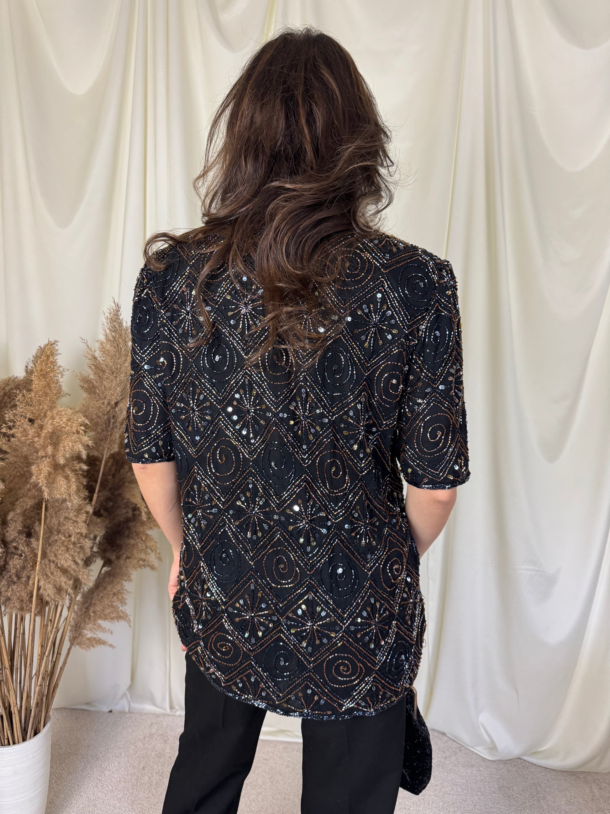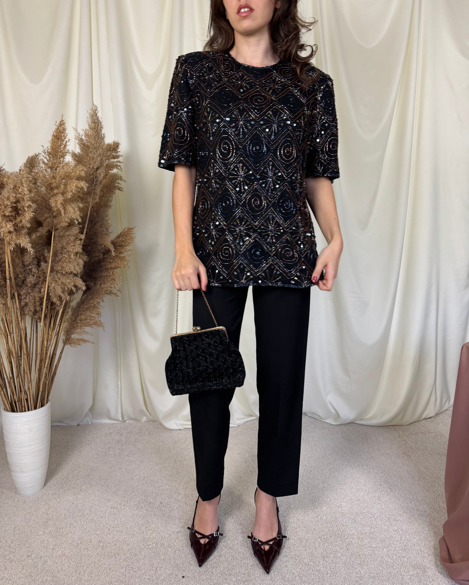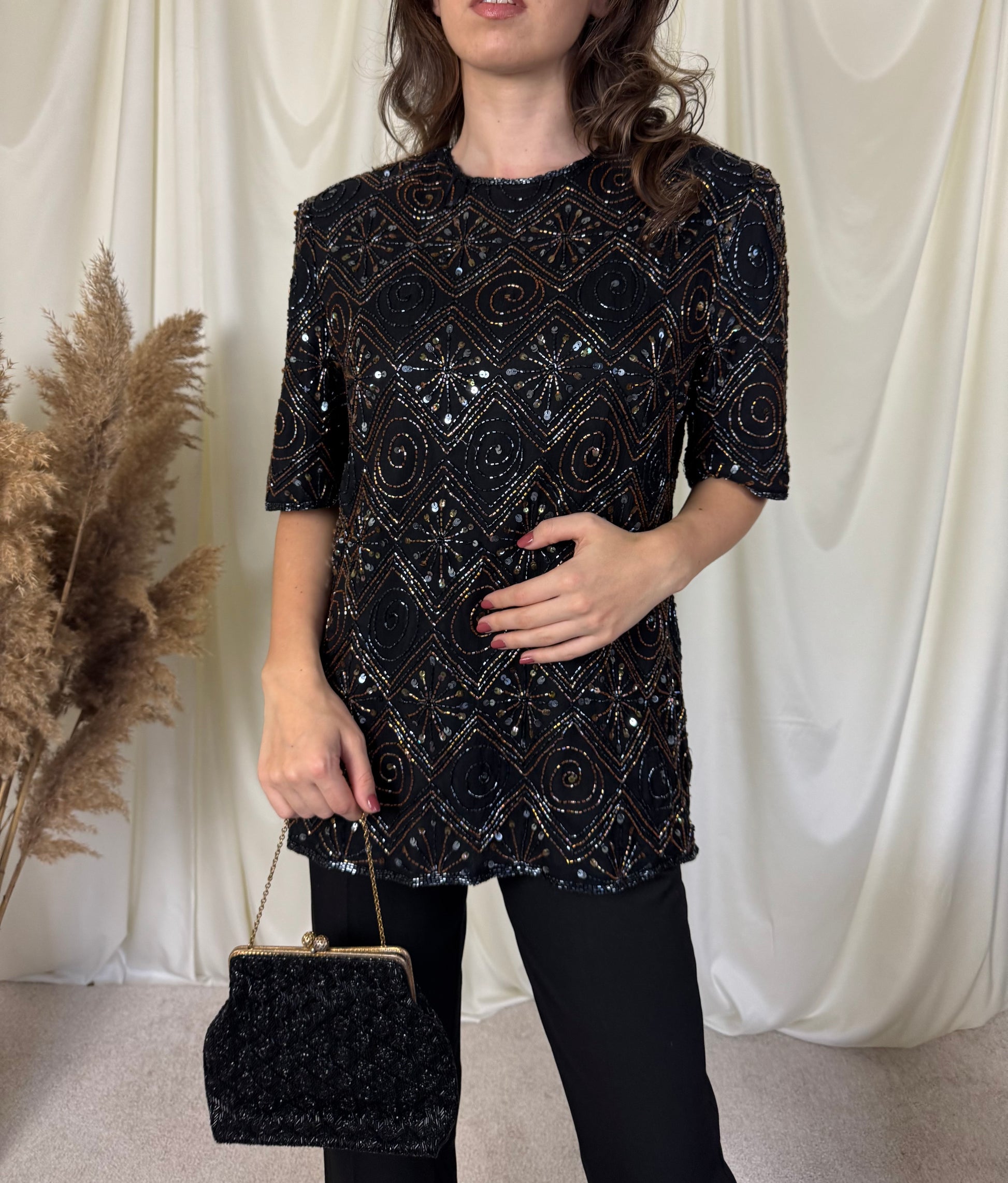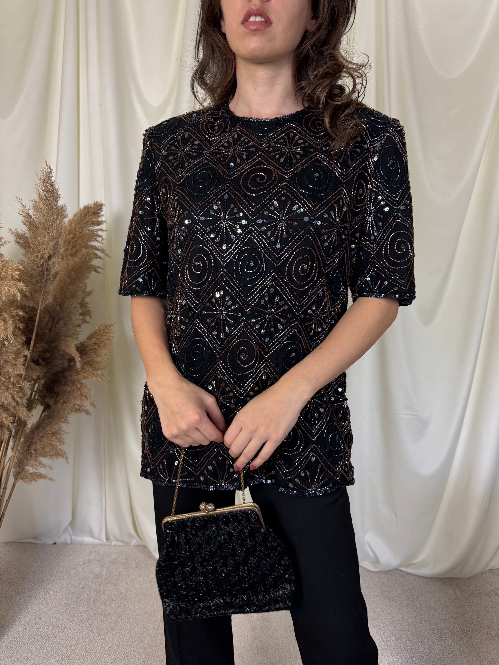 Piesă vintage superbă din mătase naturala, sute de mărgele și paiete aplicate, mărimea M/ L ( imbracat pe S
