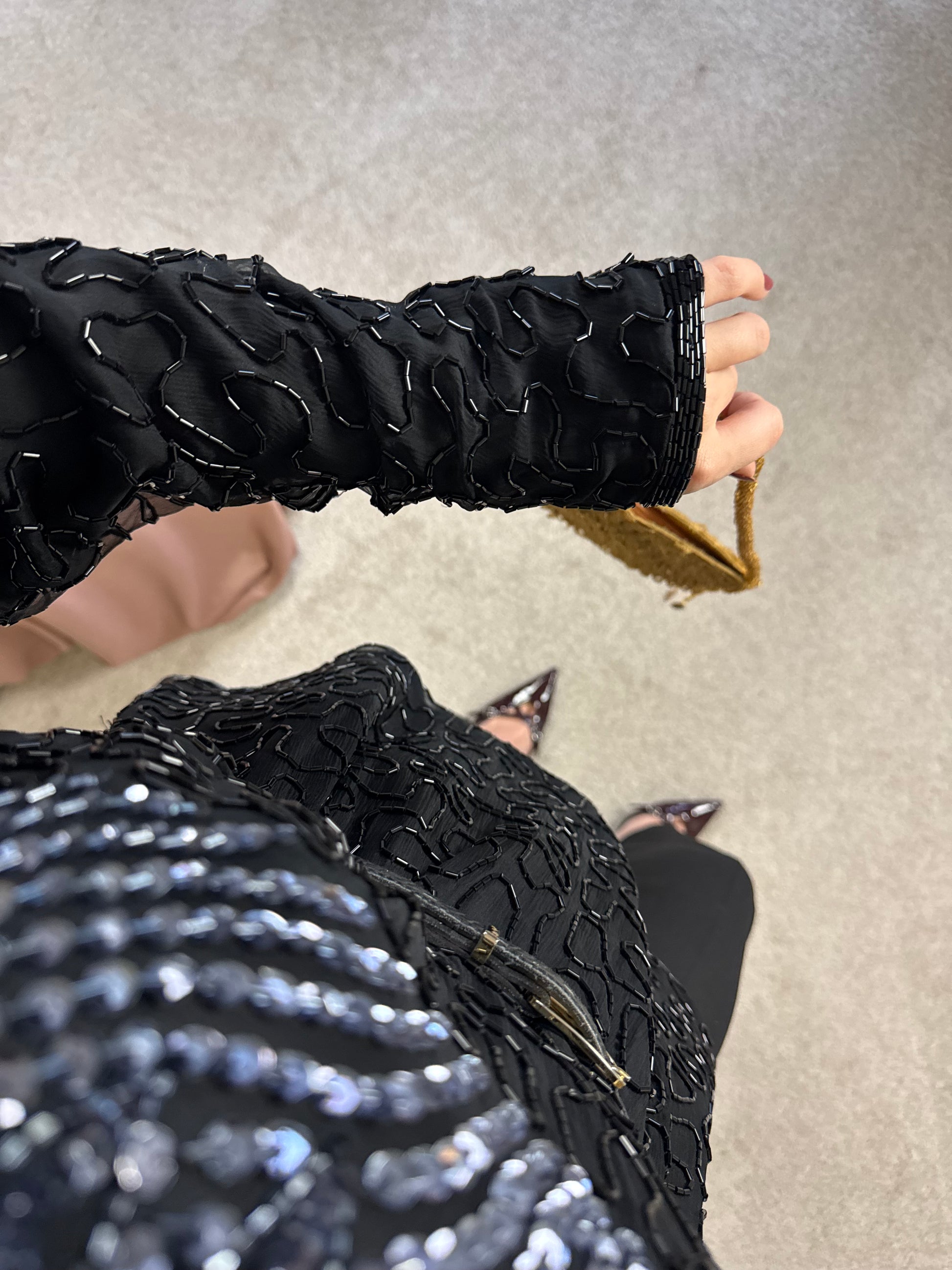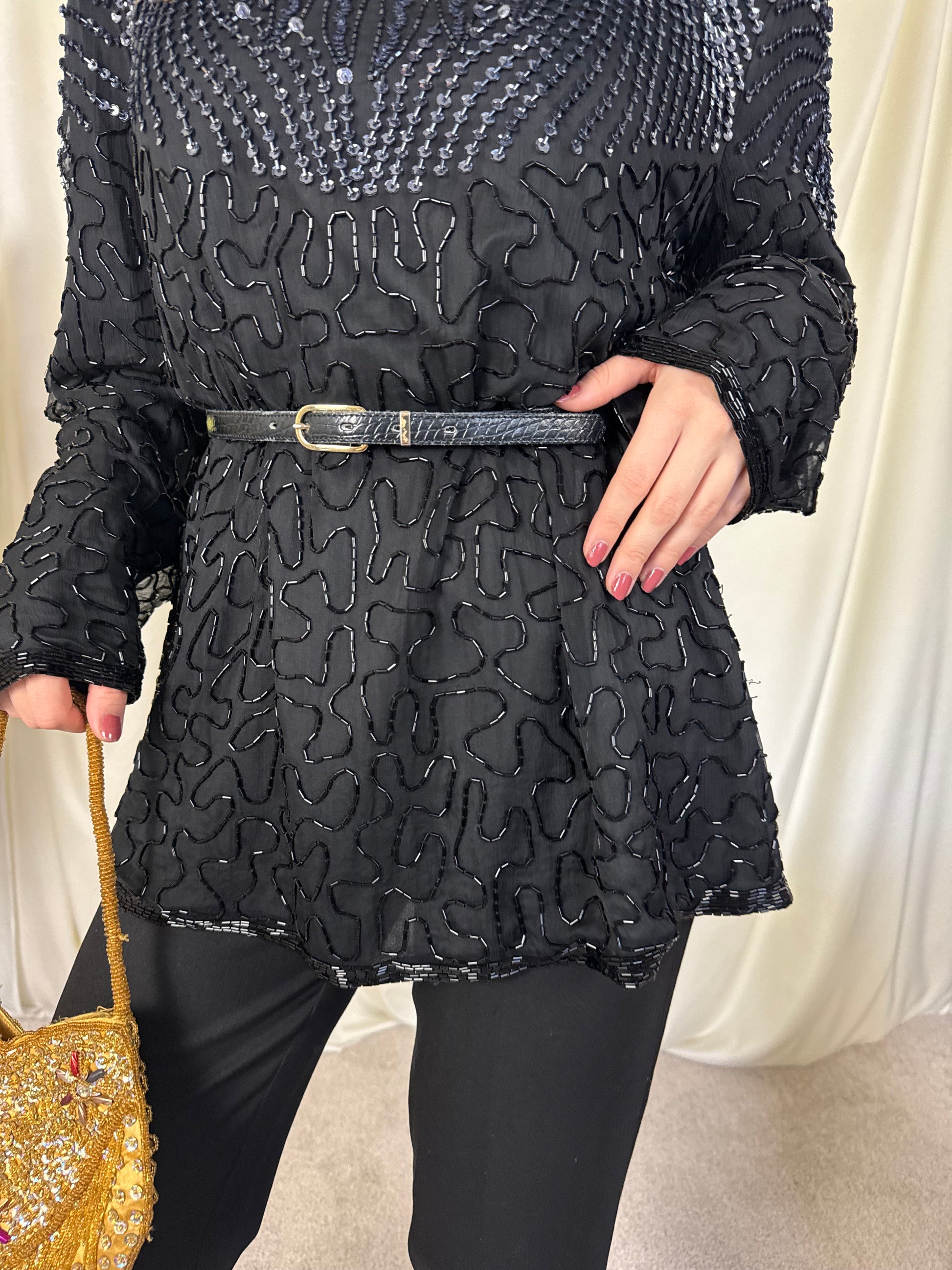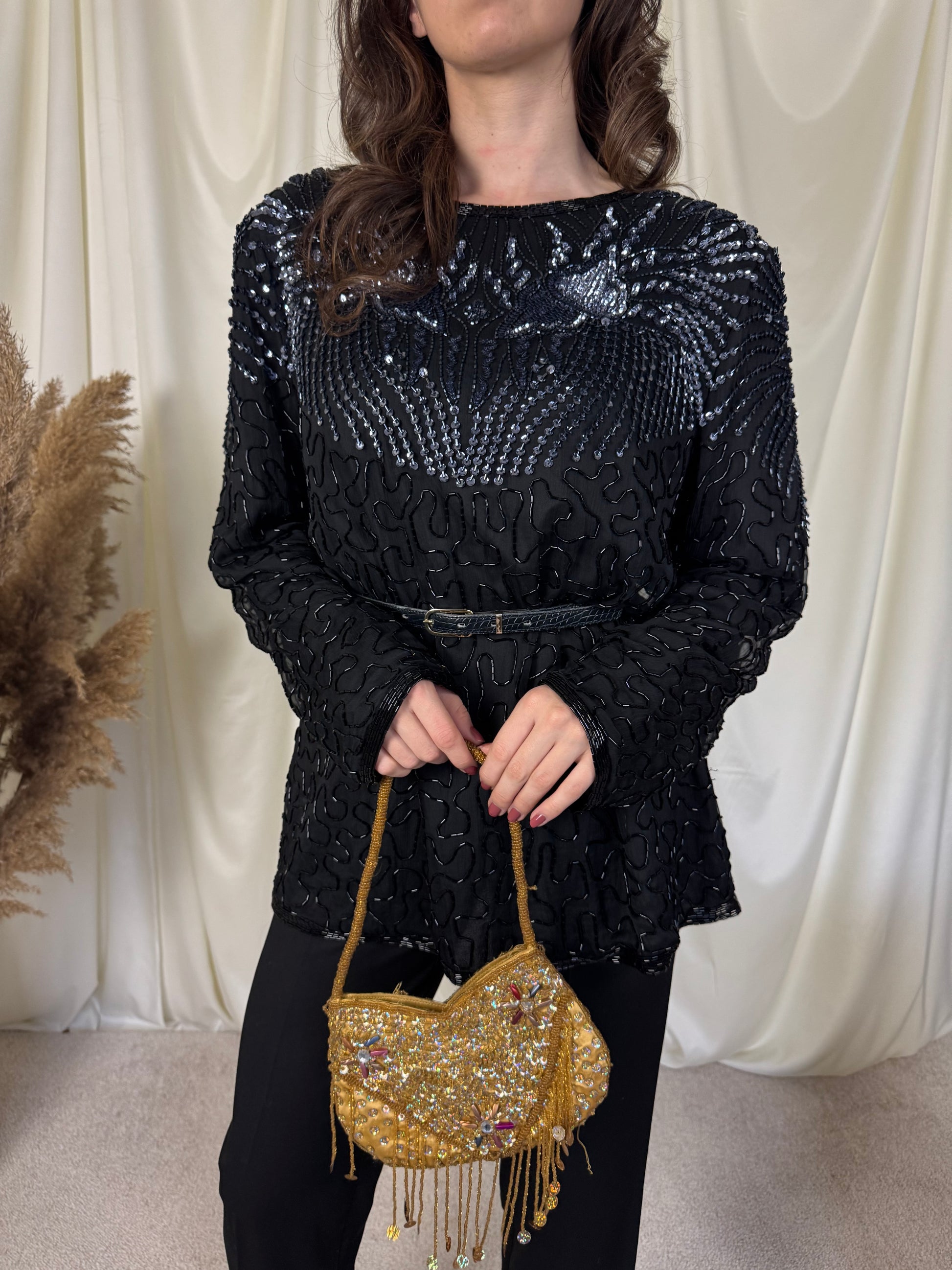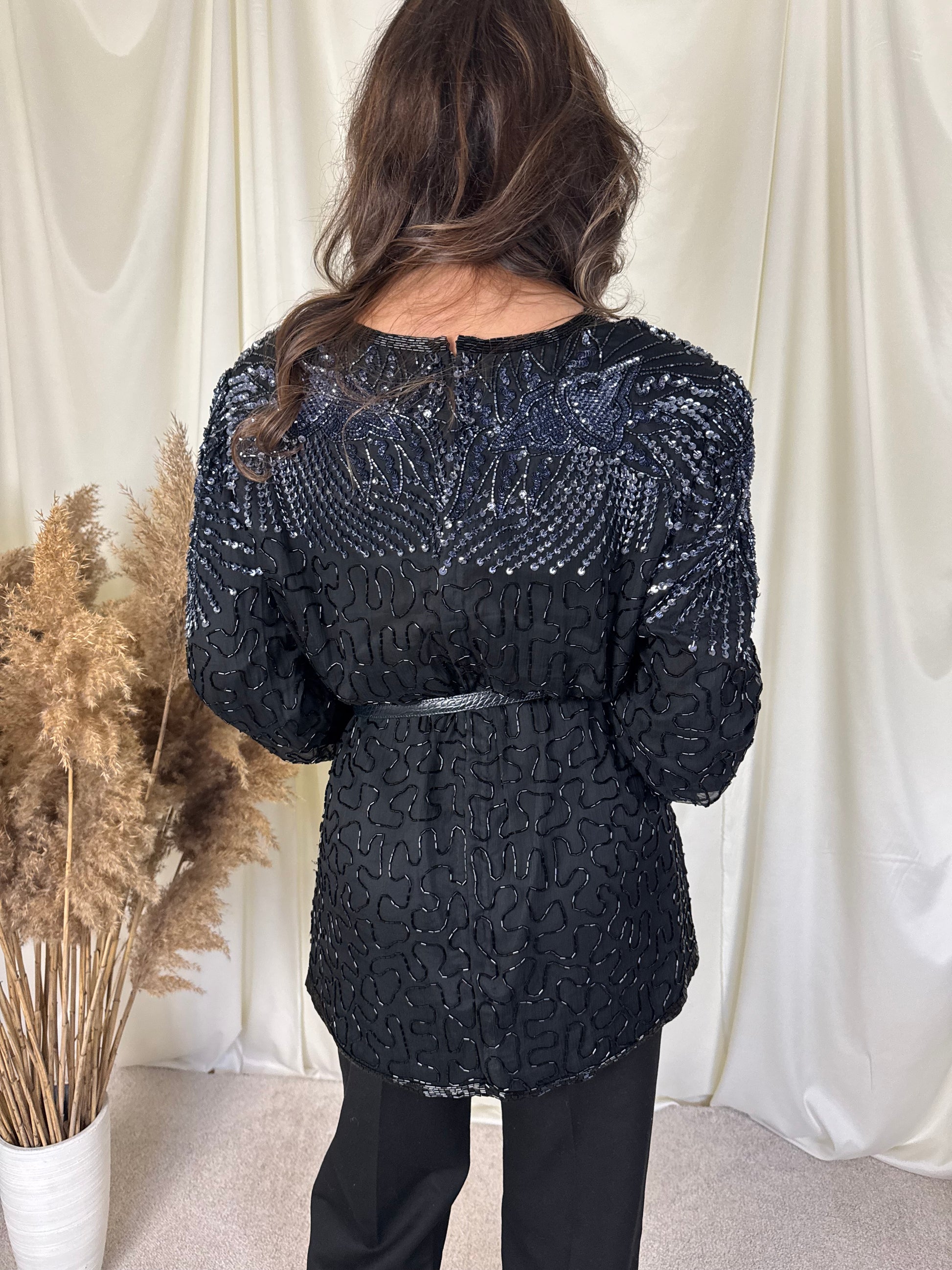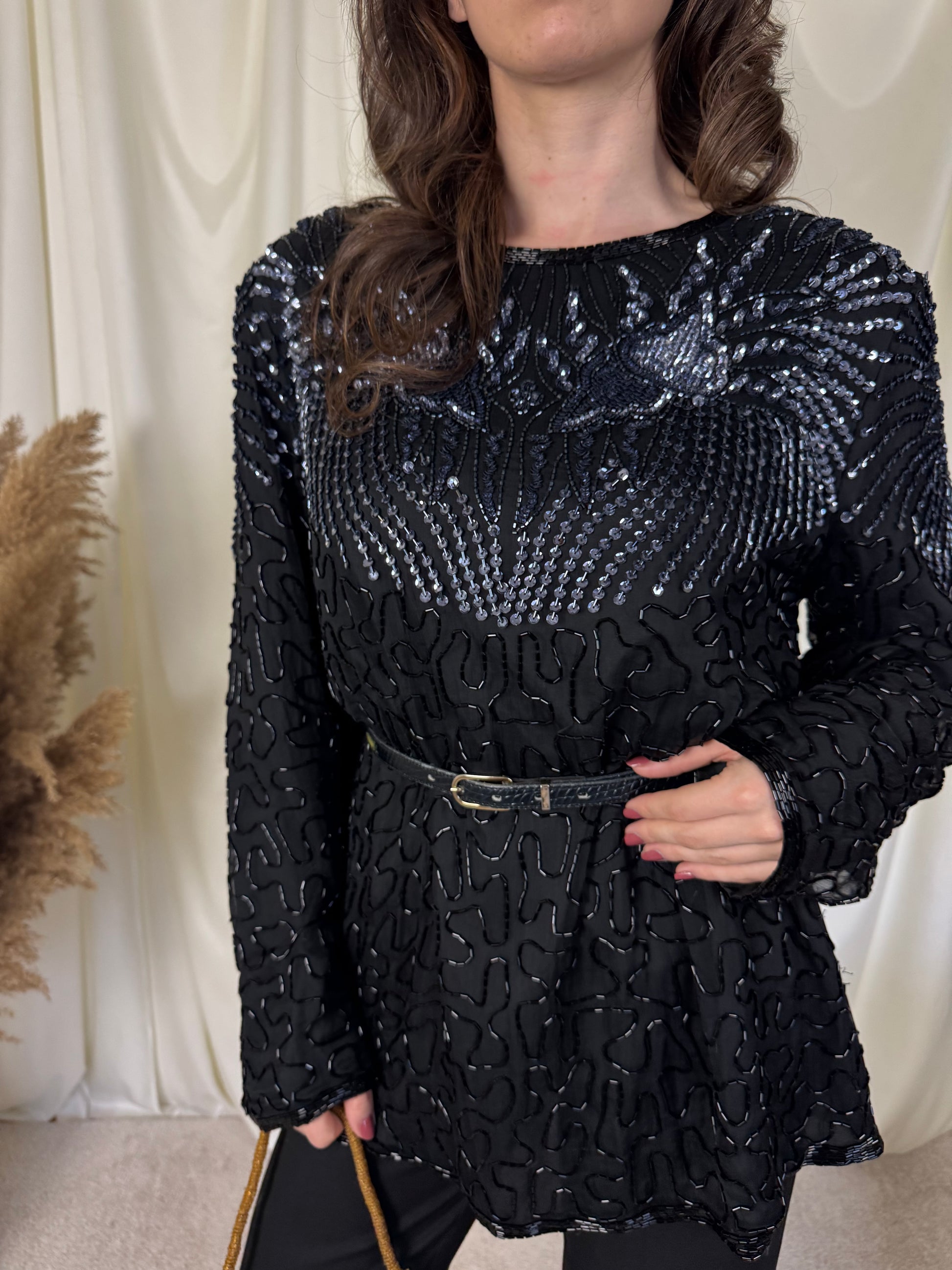 Piesa vintage superbă din 100% mătase naturală, foarte finuță, paiete și mărgele aplicate, mărimea L
