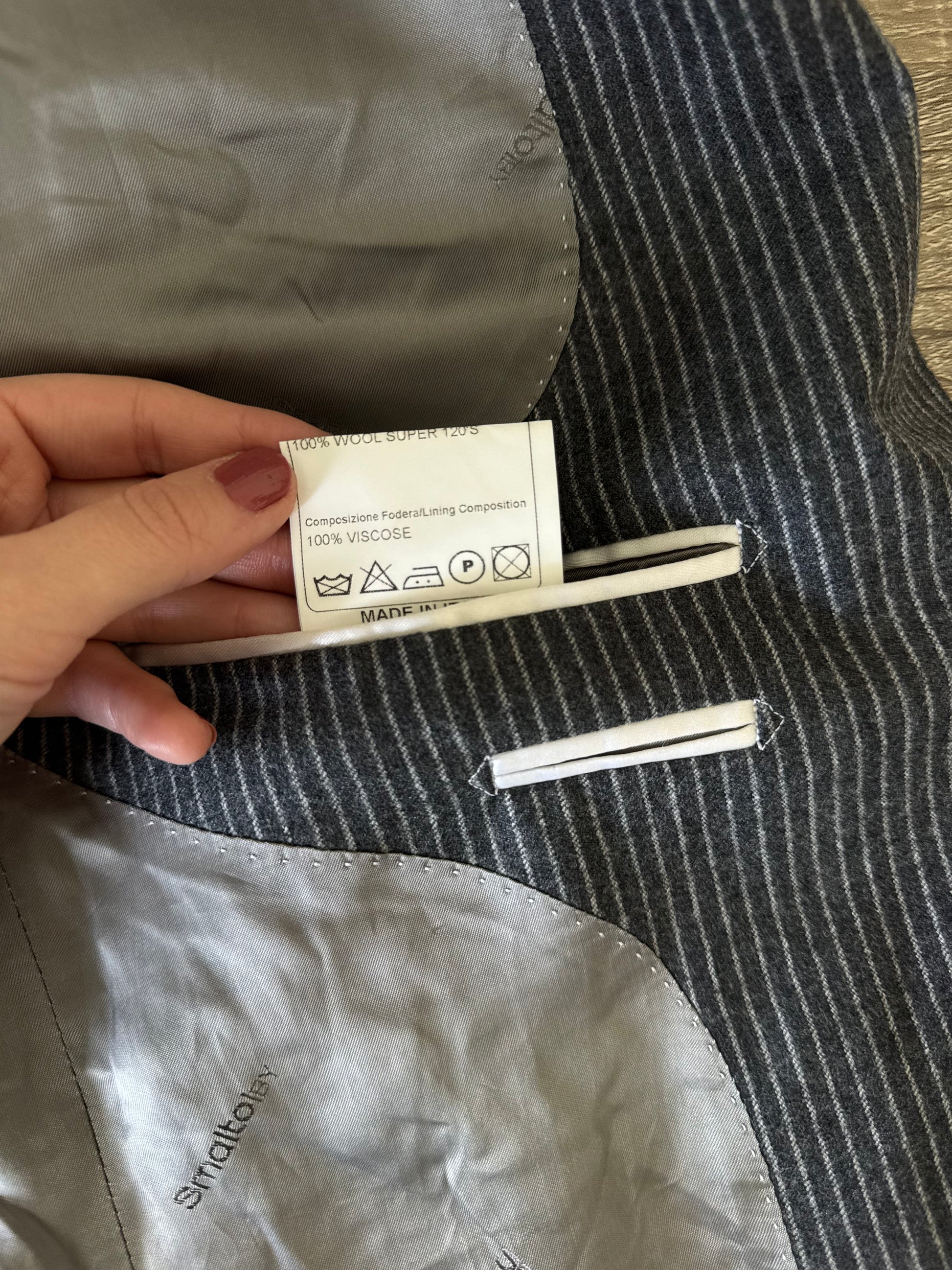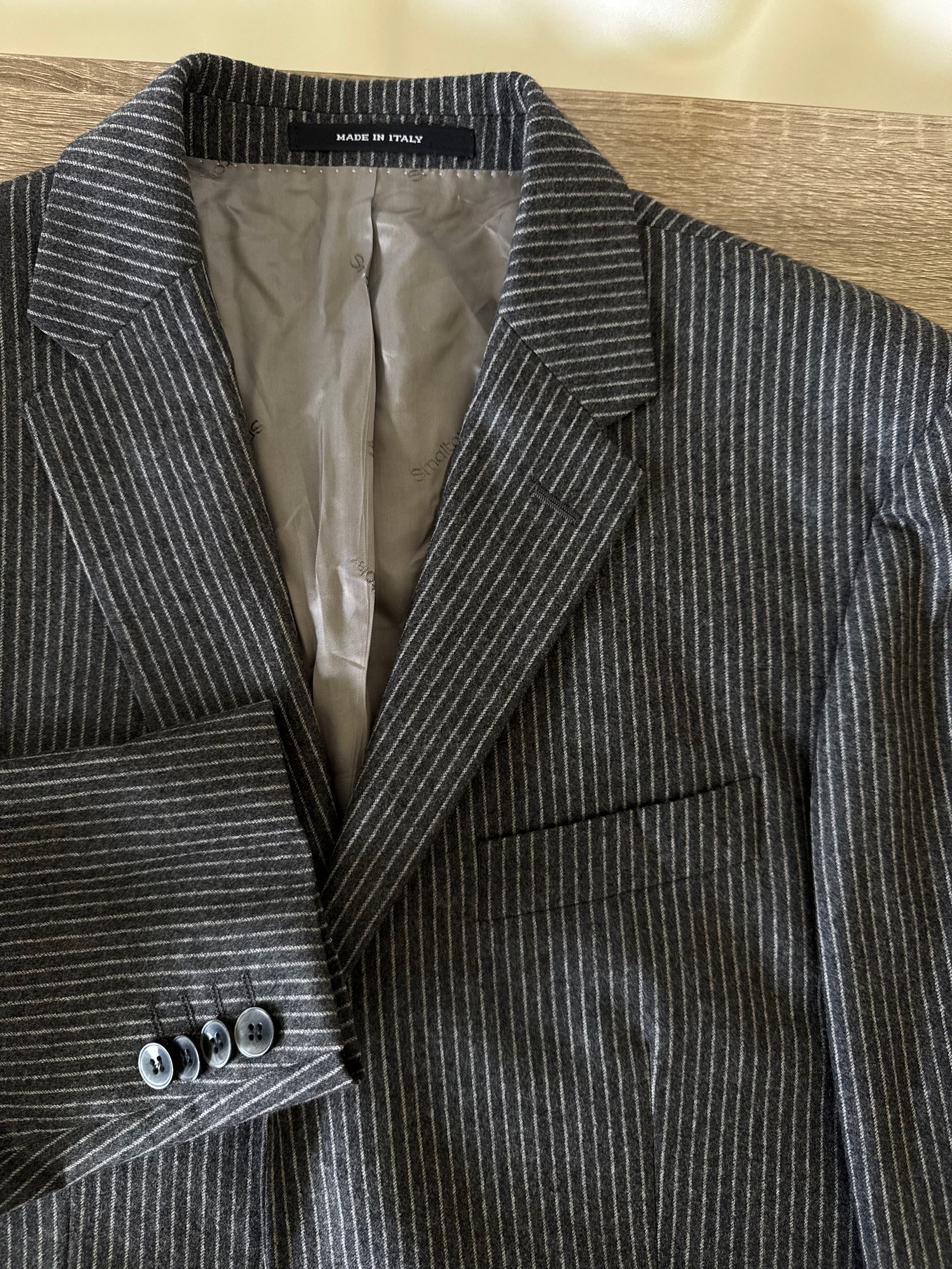 Sacou vintage premium made in Italy din Lana super 120’s- fibra super fină. Gri cu dungi fine albe.