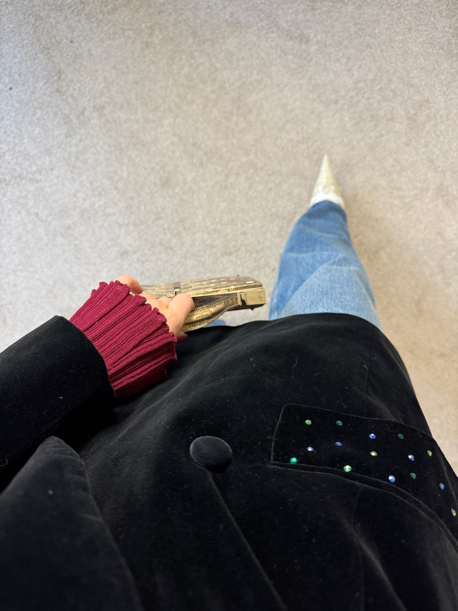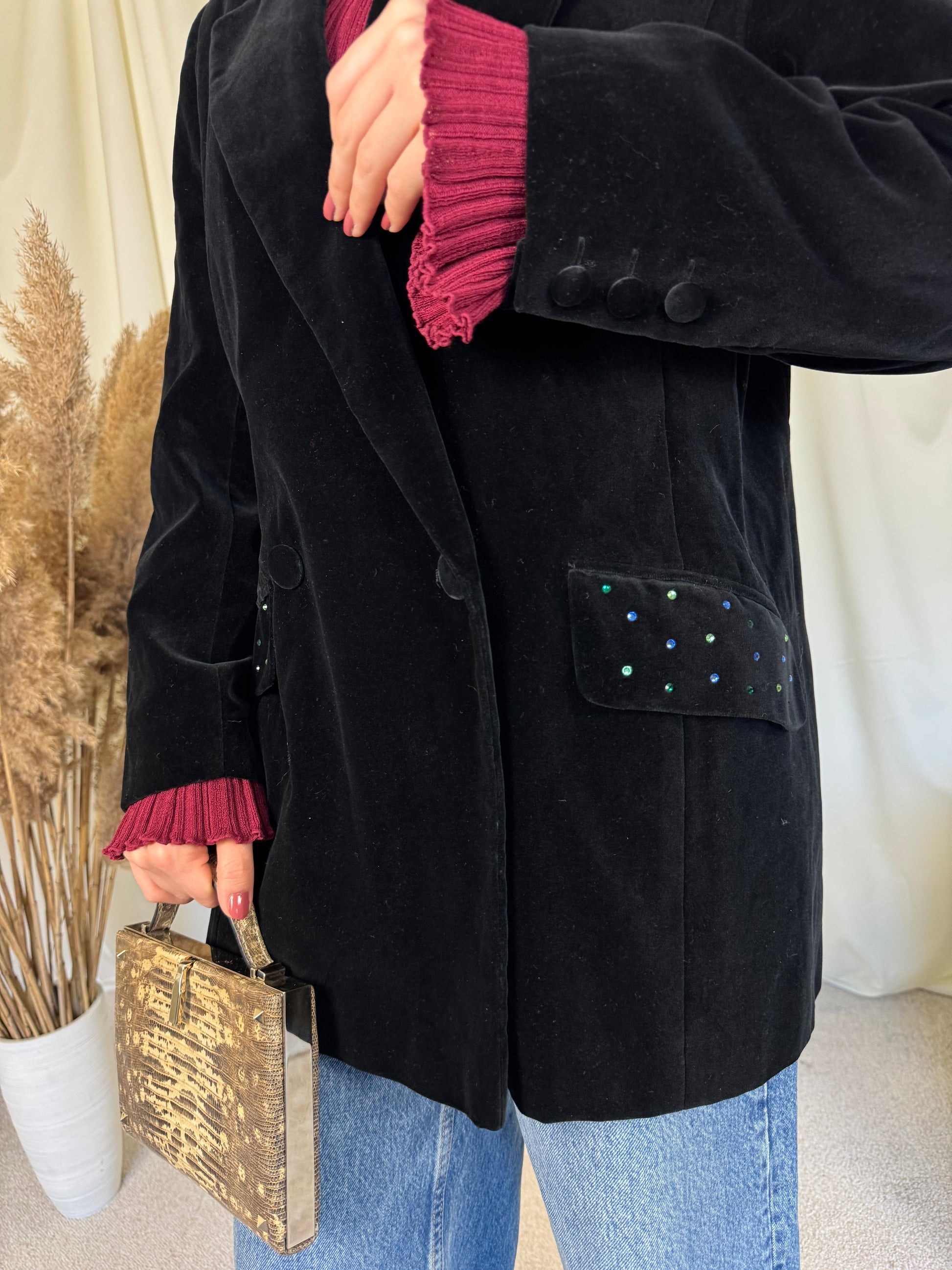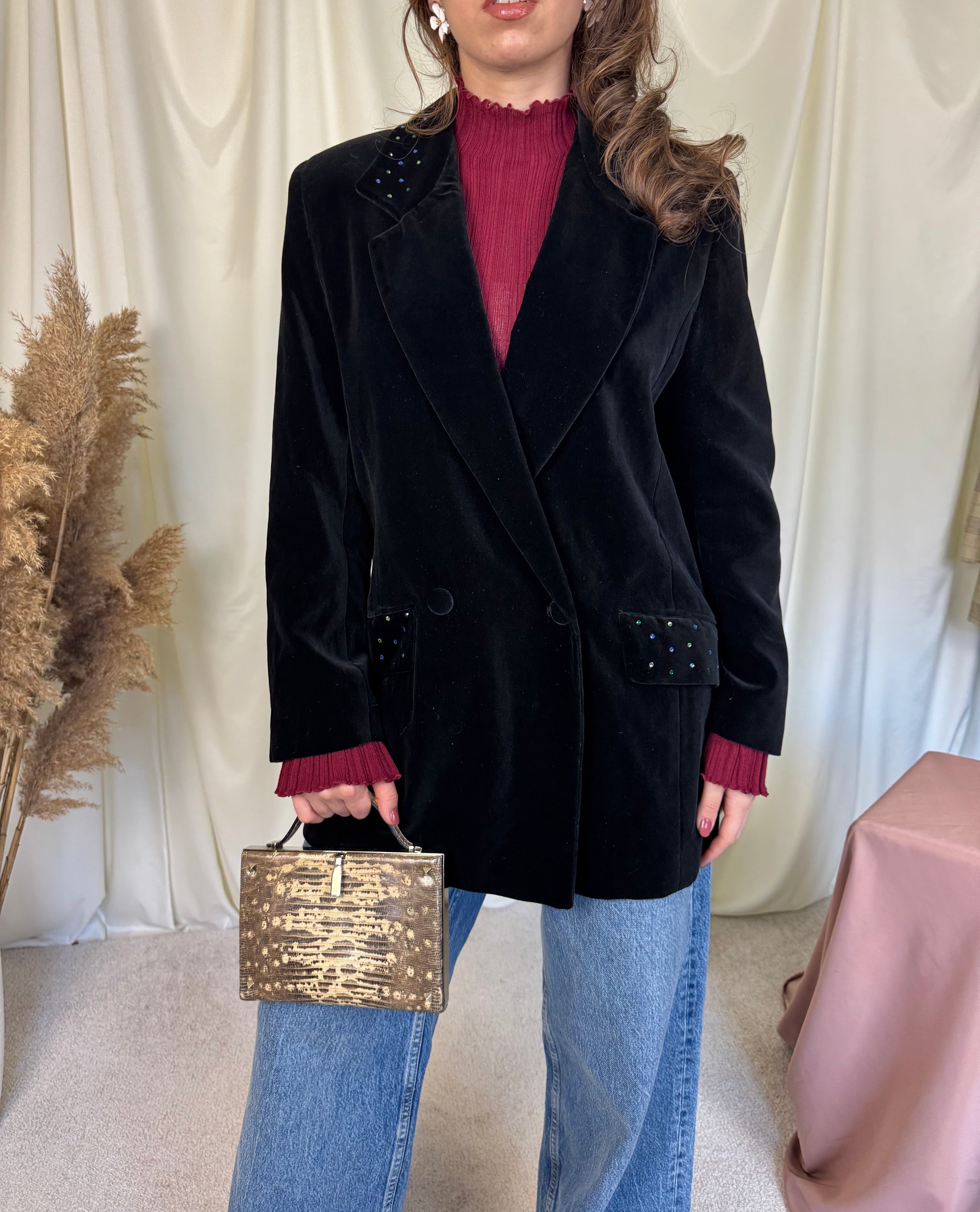 Sacou vintage superb din catifea neagră de bumbac, mărimea M/L, În poză e îmbrăcat pe S