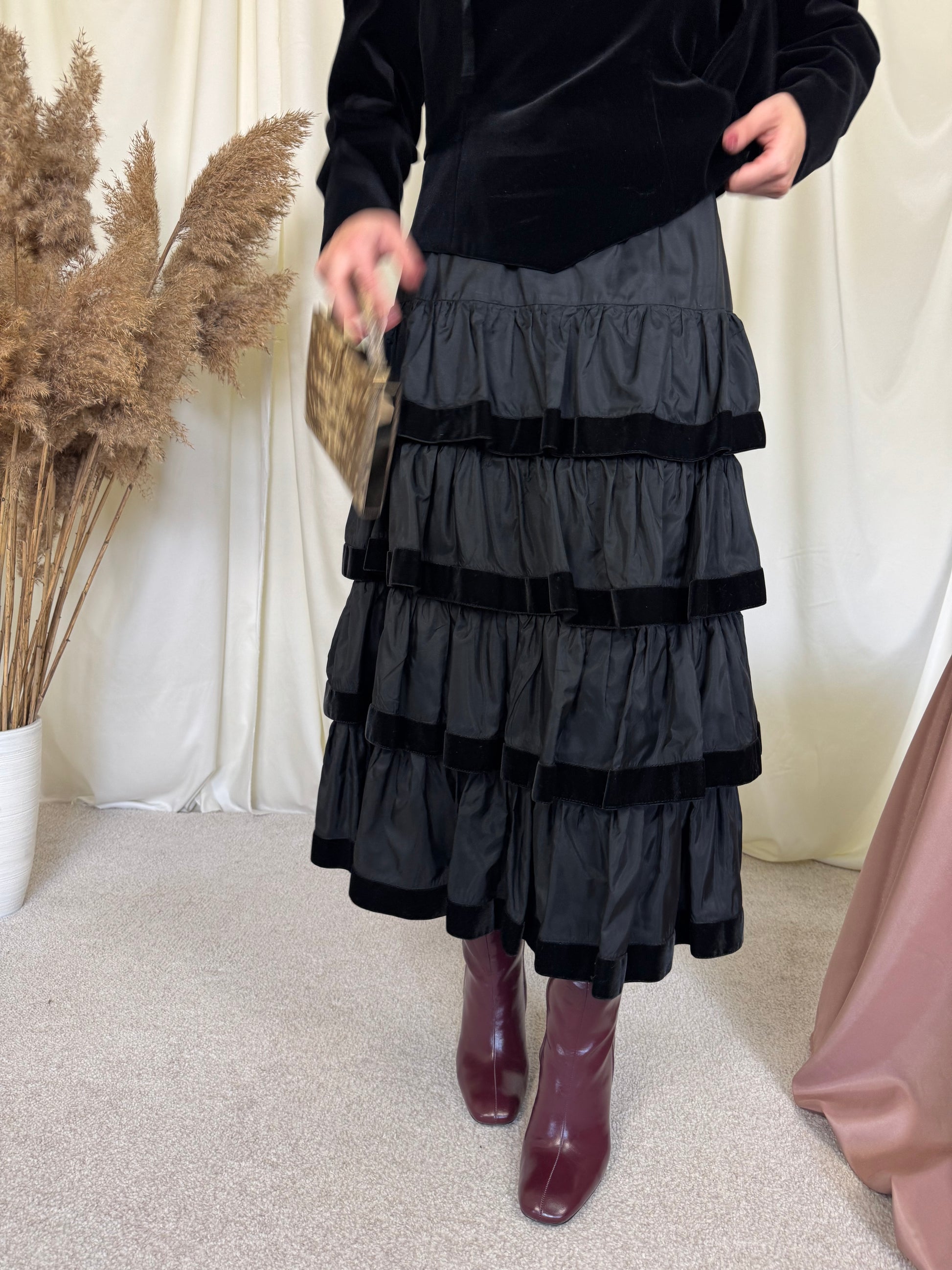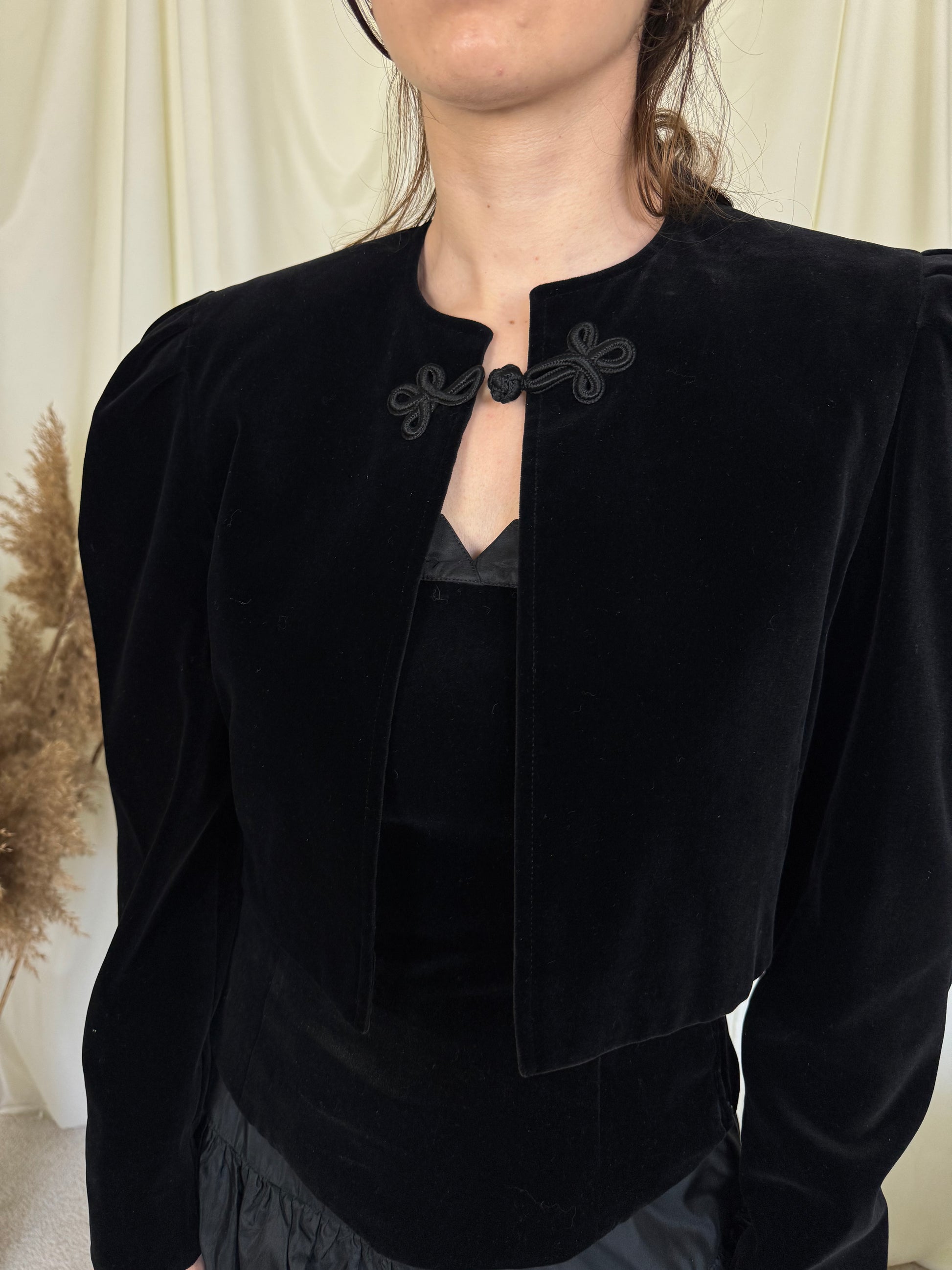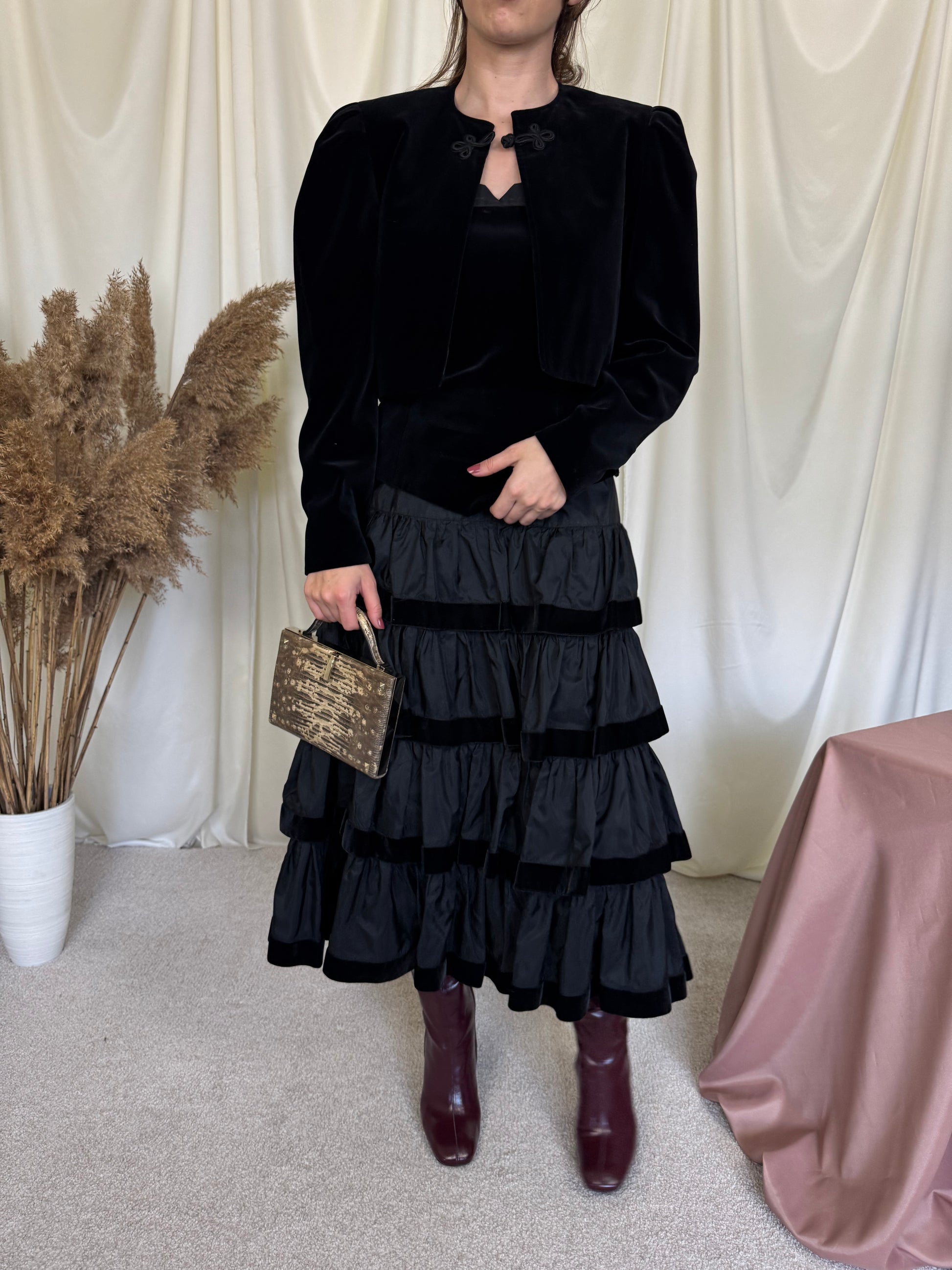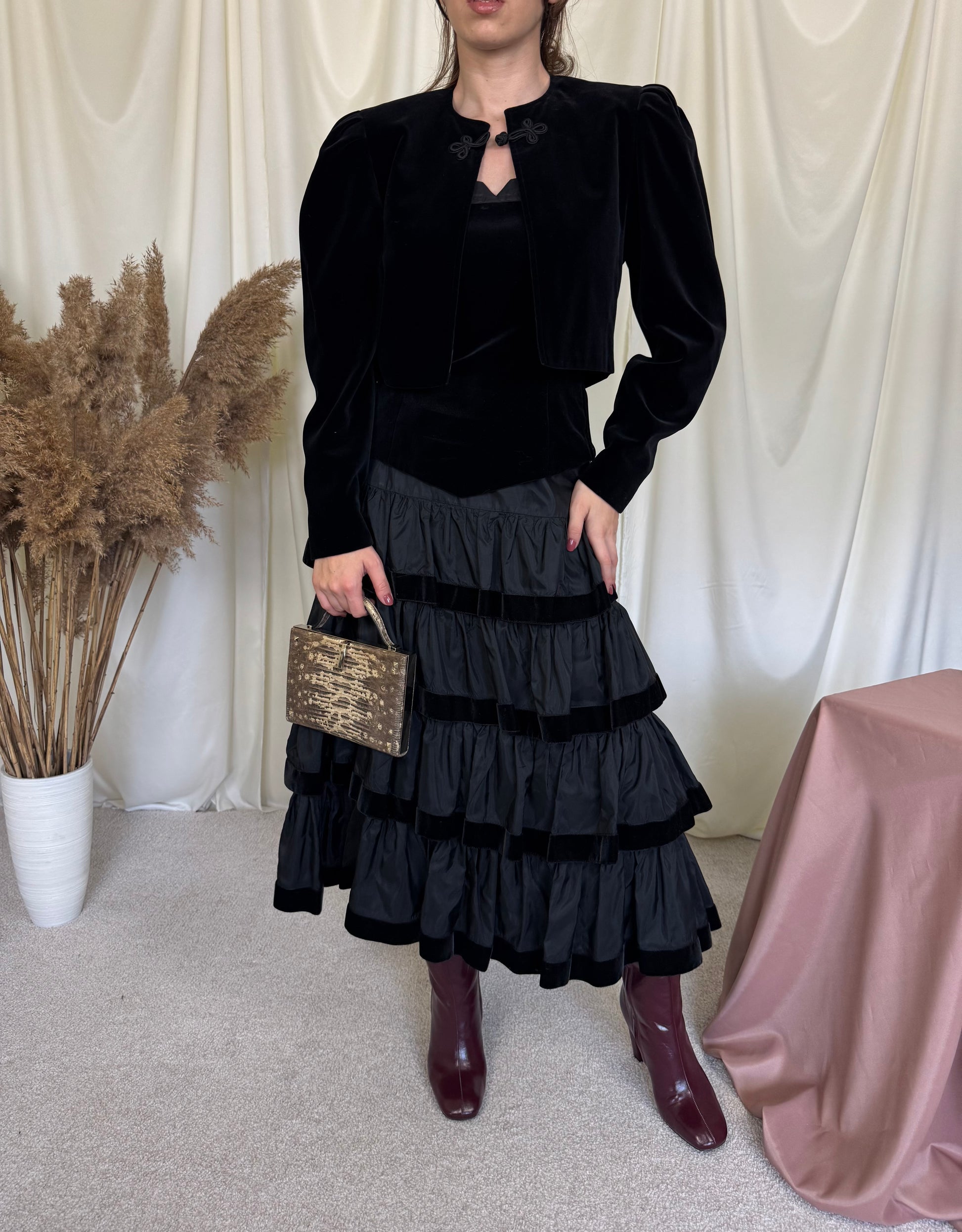 Un set vintage divin din catifea neagră de bumbac, @escadaofficial mărimea 36/S, 66 cm talie potrivit pentru orice ocazie/ eveniment special.